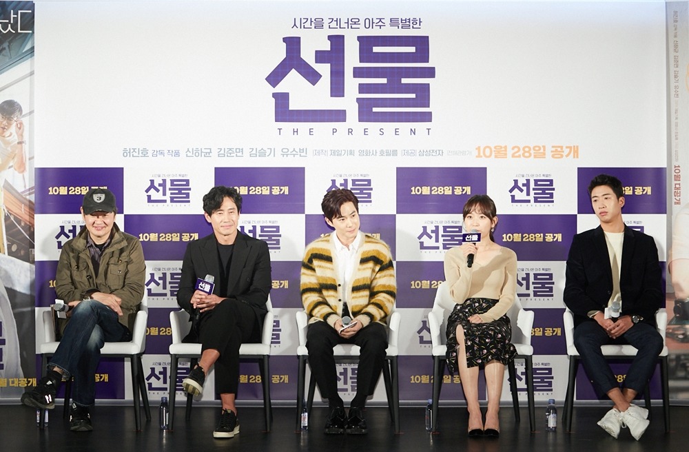 ‘선물’은 50년전인 1969년에서 현재로 온 전기기술자 상구(신하균)가 열화상 카메라를 만들기 위해 고군분투하고 있는 청년 창업가 하늘(김준면), 보라(김슬기), 영복(유수빈)을 만나 도움을 주면서 벌어지는 이야기를 담고 있으며, 과거와 현재를 오가는 ‘타임슬립’ 영화다.