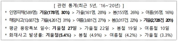 최근 5년간 해양사고 통계에 따르면, 겨울철의 경우 사고 건수는 적지만 계절 특성상 기상악화와 선내 화기사용 증가로 인명피해가 가장 많고, 화재·폭발사고 발생 비율이 높다.