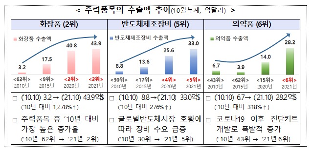 주력품목 중 화장품은 한류열풍, K뷰티의 인기에 힘입어 2010년 수출품목 62위에서 올해 2위로 급성장했고, 반도체제조장비와 K방역 관련 의약품 수출액도 약 4배까지 성장했다.