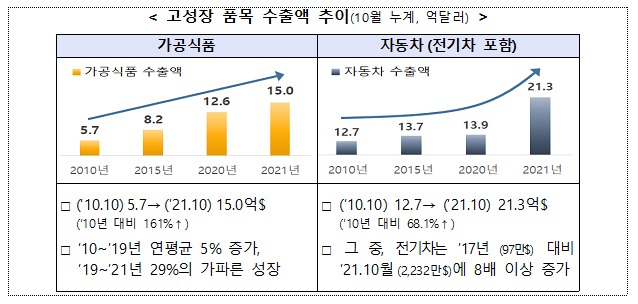 그 외 성장률이 높은 품목은 가공식품이다. K푸드 열풍으로 농산·수산·축산 가공품 수출이 2010년 대비 161% 증가한 15억 달러였다.