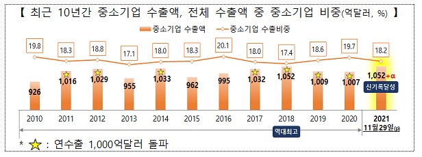 아울러 1000만달러 이상 수출기업 수는 1834개, 수출액은 499억 달러로 통계 작성 이래 최고치를 기록하며 수출 중소기업의 중추적인 역할을 담당하고 있다.