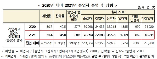 2021년 직업계고 졸업자 7만 8994명 중 취업자는 2만 2583명, 진학자 3만 5529명, 입대자 1809명, 제외인정자 862명인 것으로 조사됐다.