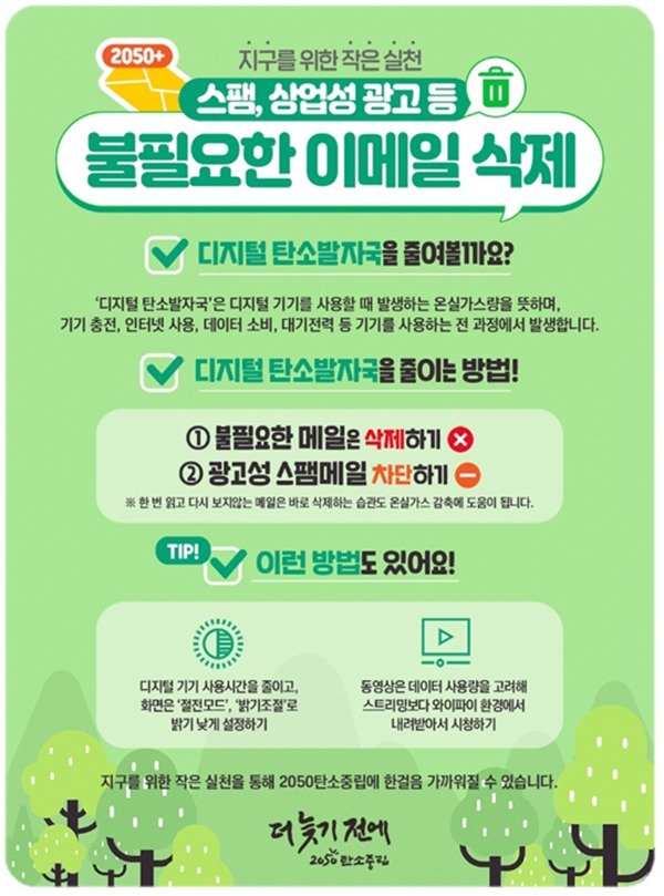 특히 과기정통부는 이번 주간 동안 ‘디지털 다이어트’를 통해 직원들이 자발적으로 스팸메일 등 불필요한 이메일을 삭제함으로써 데이터 저장과정에서 생기는 온실가스 저감운동에 동참하도록 한다.
