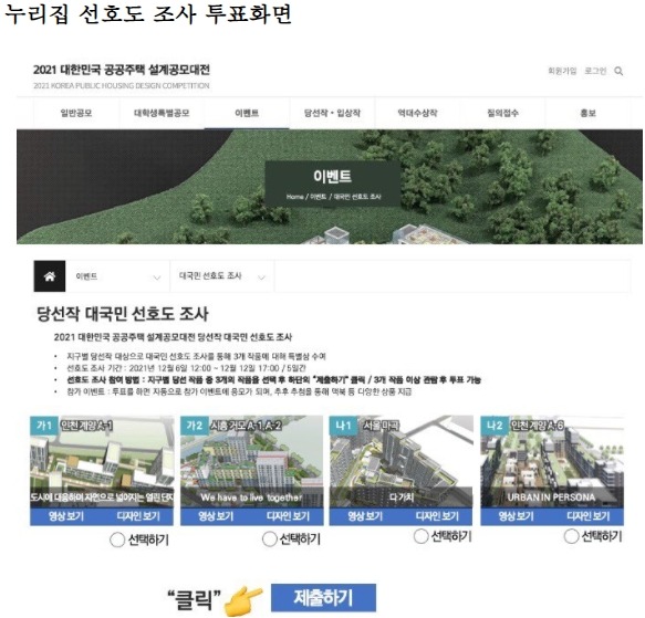 아울러, 3개 최우수작품은 설계모형도를 별도 전시공간을 마련하여 선보일 예정이며, 향후 공공주택 설계 모델로도 적극 활용할계획이다.