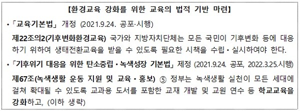정부는 지난 9월 교육기본법 개정과 탄소중립기본법 제정에 따라 기후위기 대응 교육 대전환을 위한 법적 근거를 마련한 바 있다.