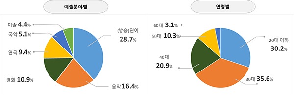 문화예술분야별로는 방송·연예 28.7%, 음악 16.4%, 영화 10.9%, 연극 9.4%, 국악 5.1%, 미술 4.4% 순이었다. 코로나19 등으로 공연활동이 어려운 분야의 피보험자 비중이 초기에는 상대적으로 적었다.
