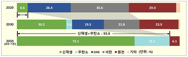 먼저, 화석연료 발전에 대해서는 암모니아·수소의 혼소·전소 등을 통해 온실가스 배출을 최소화하고, 2030년 신재생에너지 발전비중을 30.2%, 2050년 재생에너지 70% 달성을 목표로 입지·인허가 혁신, 수용성 제고 등 전방위적 추진으로 재생에너지 보급을 획기적으로 확대한다.