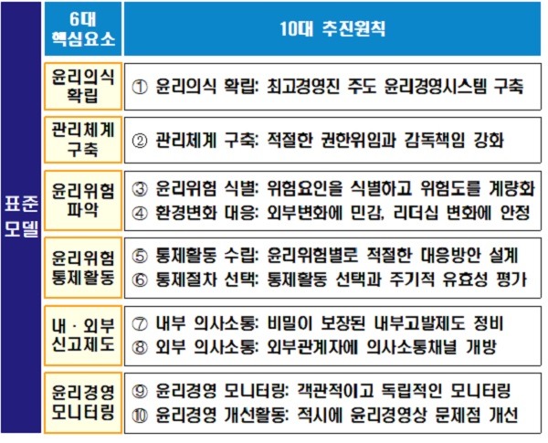 표준모델은 ▲윤리의식 확립 ▲관리체계 구축 ▲윤리위험 통제활동 ▲내·외부 신고제도 ▲윤리경영시스템 모니터링 등 6대 핵심요소로 구성돼 있다. 공공기관은 이를 바탕으로 개별 기관에 맞는 윤리경영시스템을 구축해야 한다.