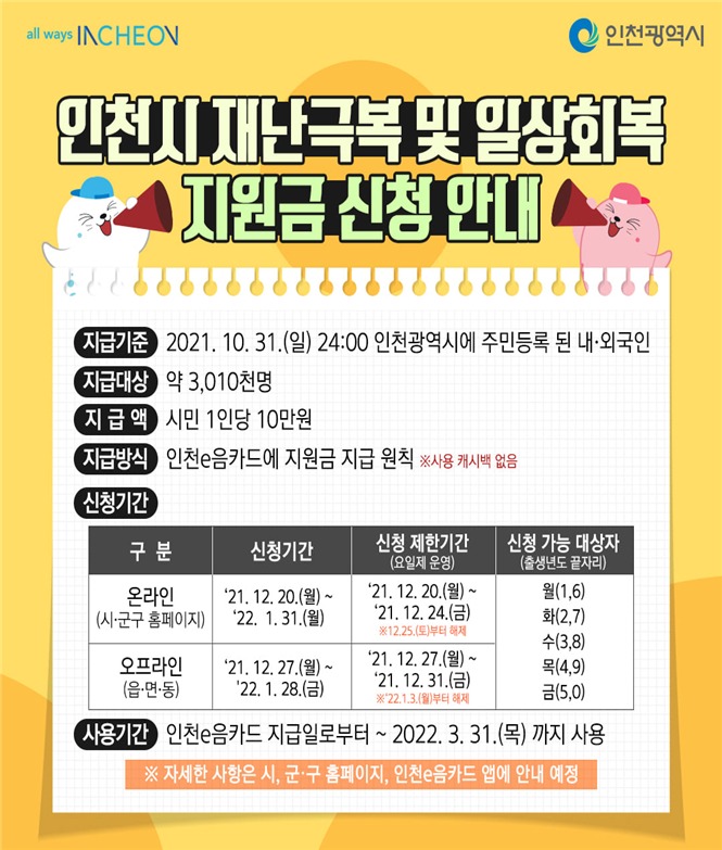 인천광역시는“코로나19로 멈춘 인천시민의 일상과 절박한 시민의 어려움을 외면하지 않고 지역경제 회복을 위한 골든타임을 놓치지 않기 위해 시민들에게 재난극복 및 일상회복지원금을 긴급 지원 한다”고 밝혔다.