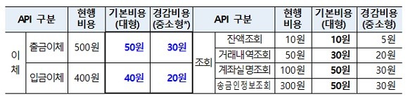 은행과 핀테크 기업 입장에서는 수수료 인하 혜택을 받는다. 오픈뱅킹 이용과정에서 은행 등 이용기관이 내는 수수료는 기존 금융결제망 이용 수수료의 10분의 1 수준(중소형은 약 20분의 1 수준)으로 낮췄다. 이에 따라 출금 이체 수수료(기존 500원)는 30∼50원, 입금 이체 수수료(400원)는 20∼40원으로 각각 내려간다.