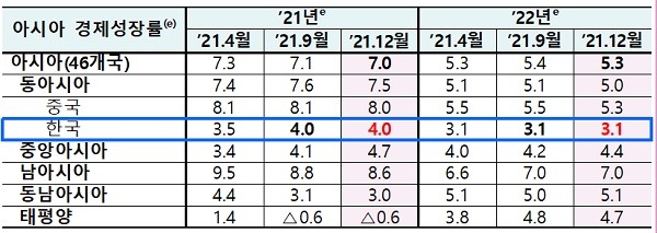 49개 아시아 역내국 중 일본, 호주, 뉴질랜드를 제외한 46개국의 내년 평균 경제 성장률은 5.3%, 올해 성장률은 7.0%로 9월보다 모두 0.1%p씩 내렸다.