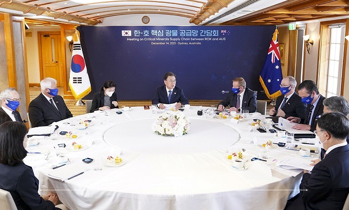 호주를 국빈 방문 중인 문재인 대통령은 14일 오후 시드니 한 호텔에서 열린 ‘한-호주 핵심광물 공급망 간담회’에 참석, 호주 기업인들을 직접 만나 양국 간 핵심광물 협력 확대 방안을 논의했다.