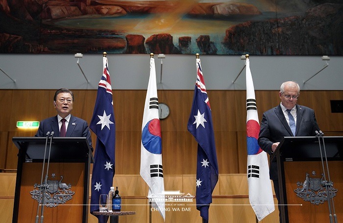 문 대통령은 “수교 60주년을 맞아 이번에 양국관계를 ‘포괄적 전략 동반자 관계’로 격상했다”며 “호주와 우리는 지난해와 올해 G7에 함께 초대될 만큼 국제사회의 주요 국가로 성장했다”고 언급했다.