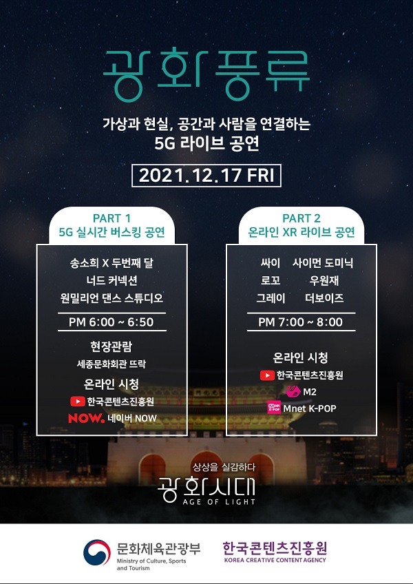 두 번째 주제인 ‘온라인 확장현실(XR) 실시간 공연’은 우리나라 최초로 확장현실 기술을 활용한 가상 실시간 공연으로 진행된다. 언리얼 엔진을 기반으로 구현한 가상의 광화문 배경에서 싸이(Psy), 더보이즈, 사이먼도미닉, 에이오엠지(AOMG) 로꼬, 그레이, 우원재 등 인기 케이팝 가수들이 화려한 무대를 선사할 예정이다.