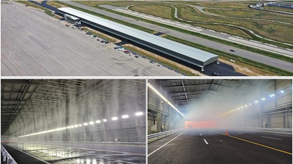 터널형의 실험시설은 5mm/h에서 60mm/h까지 다양한 강우 상황 재현과 시정거리 30m까지의 안개 상황을 재현할 수 있다.