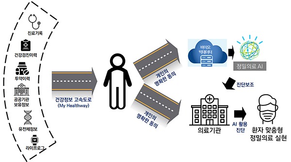 병원과 공공기관 등에는 흩어진 개인 건강정보를 마이 헬스웨이 플랫폼을 통해 국가 바이오 빅데이터로 연계·제공하며, 암과 심·뇌혈관 등 주요 질환을 시작으로 다기관·다유형의 개인 건강정보를 활용한 정밀의료 AI 개발·실증 R&D를 2023년부터 추진한다.
