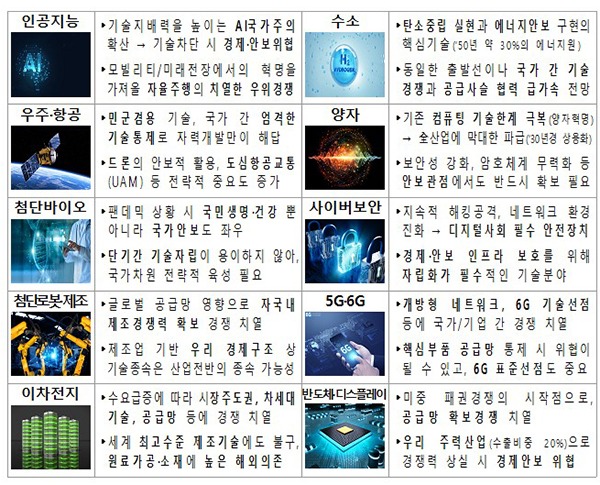 이번에 선정한 10개 분야는 ▲인공지능 ▲5G·6G ▲첨단바이오 ▲반도체·디스플레이 ▲이차전지 ▲수소 ▲첨단로봇·제조 ▲양자 ▲우주·항공 ▲사이버보안이다.