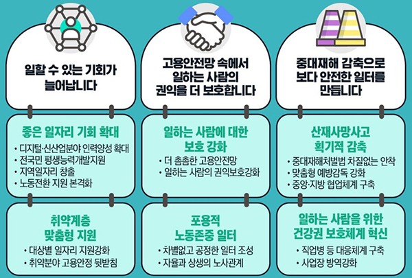 또한 가사근로자법 시행과 플랫폼 종사자 등 일하는 사람의 권익 보호를 확대하고, 중대재해처벌법 안착과 현장 중심 맞춤형 감독으로 산재사망자 수 감축을 도모한다.