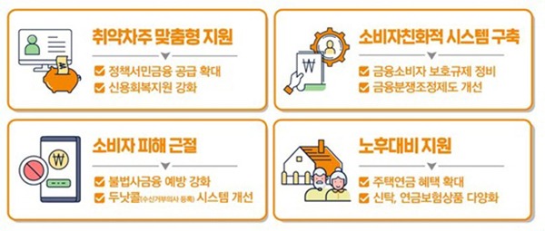 금융소비자 후생증진 관점에서 규제 및 금융관행을 개선하고 고령화에 대비한 노후자산 축적·노후소득 확대도 지원하는데, 취약고령층 대상 우대형 주택연금 지원범위 및 혜택 등을 확대한다.