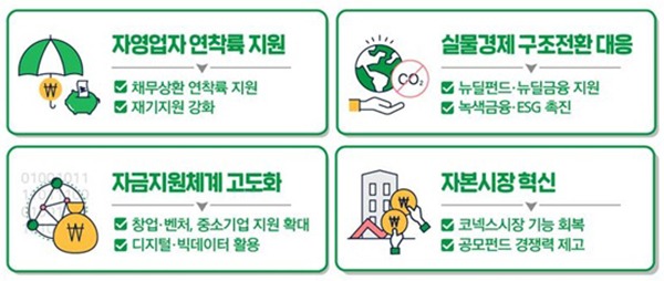 또한 정책금융 200조원 공급을 토대로 디지털·탄소중립 등 경제구조 전환을 뒷받침하고 ESG 공시 및 투자가 촉진되도록 시장규율체계를 정비하며, 정책서민금융 10조원과 중금리대출 35조원 공급을 확대할 계획이다.