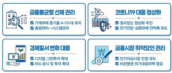 이를 위해 금융불균형 선제관리 및 코로나19 대응조치 정상화를 통해 금융안정을 견지하고, 금융제도 혁신 및 금융디지털화 촉진을 통해 금융역동성을 제고할 방침이다.