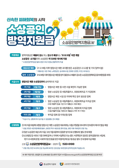 중소벤처기업부는 소상공인들의 피해회복과 방역활동 지원을 위해 지급하는 ‘소상공인 방역지원금’의 세부 지원계획을 23일 발표했다.