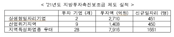 한편, 산업통상자원부는 지방투자촉진보조금 제도를 통해 지난해 69개 지방투자 기업에게 국비 1923억을 지원하기로 결정해 향후 3년 동안 지방에 1조7200억원 규모의 민간 투자를 유도하고, 3400개의 신규 일자리를 창출할 수 있을 것으로 기대된다.
