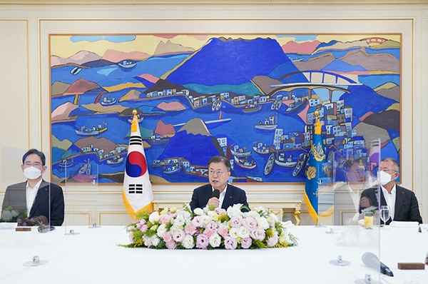 이날 행사는 정부의 고용 창출 프로젝트인 청년희망온에 참여해 향후 3년 간 17만9000개의 청년 일자리 창출을 약속한 6개 대기업을 격려하기 위해 마련됐다. 이재용 삼성전자 부회장, 정의선 현대자동차그룹 회장, 최태원 SK 회장, 구광모 LG 회장, 최정우 포스코 회장, 구현모 KT 대표 등이 참석했다.