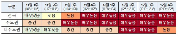 다만 “주간 위험도 평가 결과 종합적인 위험도는 전국과 수도권에서 ‘매우 높음’이며, 비수도권은 이전의 ‘매우 높음’에서 한 단계 하향돼 ‘높음’으로 평가됐다”고 덧붙였다.