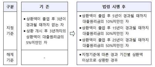 또 최근 변화하는 청년들의 구직 상황 등을 반영하고, 학자금 대출의 건전성을 높이기 위해 장기미상환자 지정·해제 요건 등이 정비됐다.