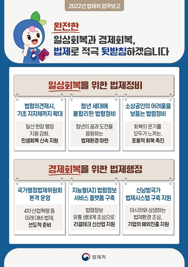 이강섭 법제처장은 “완전한 일상회복과 경제회복을 뒷받침하는 법제 지원으로 국민들께서 국정 성과를 체감할 수 있는 법제 서비스를 제공하는 데 최선을 다하겠다”고 밝혔다.