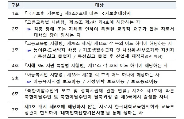 선발대상은 ▲(1호)국가보훈대상자 ▲(2호)각종 장애 또는 지체로 인해 특별한 교육적 요구가 있는 자로서 대학의 장이 정하는 자 ▲(3호)농어촌·도서벽지 학생/기초생활수급자 및 차상위·한부모가족 지원자/특성화고 졸업자/특성화고 졸업 후 3년 이상 산업체 재직자 ▲(4호)‘서해 5도 지원 특별법 시행령’ 제11조 각 호의 어느 하나에 해당하는 자 ▲(5호)아동복지시설 보호아동·가정위탁 보호아동·보호종료아동 ▲(6호)북한이탈주민 및 북한이탈주민이 탈북과정 중 제3국에서 출생한 자녀 ▲(7호) 제1호 내지 제6호에 해당하지 않는 자로 ‘대학입학전형기본사항’을 통해 정하는 자 등이다.