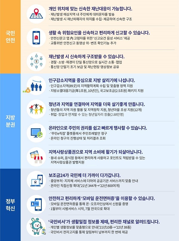 아울러 국민의 활용도가 높은 ‘국민비서’, ‘보조금24’, ‘생애주기 원스톱 서비스’의 제공 영역을 지속적으로 확대한다.