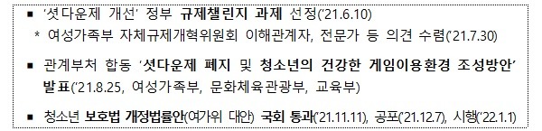 한편 정부는 지난 10년간 셧다운제가 적용되지 않는 모바일 게임이 PC 게임을 대체하는 등 게임이용 환경이 크게 변화했고, 청소년들이 심야에 이용할 수 있는 매체가 사회관계망서비스(SNS), 인터넷동영상서비스(OTT), 유튜브 등으로 다양해짐에 따라 ‘셧다운제 개선’을 ‘규제챌린지’ 과제로 선정해 실효적인 청소년 보호방안을 원점에서 재검토해 왔다.