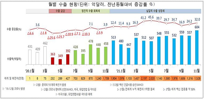 수출 증가세는 올해 본격화되면서 올 1~4월 누적 수출액이 1976억 달러로 역대 최대를 기록했다. 10월에는 역대 최단기간 무역액 1조 달러를 달성했으며 11월에는 604억 달러로 월 수출실적이 최초로 600억 달러를 돌파했다.