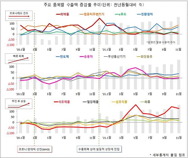 코로나19 진단키트 등 의약품·컴퓨터 주변기기·간편식·친환경차 등은 수출이 급감했던 시기에도 수출액이 전년 대비 증가하는 등 호조를 보였다.