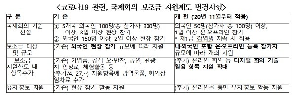 이를 통해 코로나19 확산에 따라 해외 입국자에 대한 입국 제한 조치가 강화된 2020년 4월 13일 이후 국내에서 열린 회의도 개정된 요건 충족 때 소규모 또는 온·오프라인 혼합형 국제회의까지 유치·개최 지원을 받을 수 있는 근거를 마련했다. 국제회의 보조금 지원제도도 개편해 내·외국인 포함 온·오프라인 등록 참가자 규모 등에 따라 업계를 지원했다.