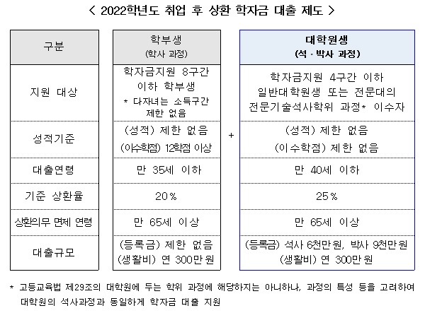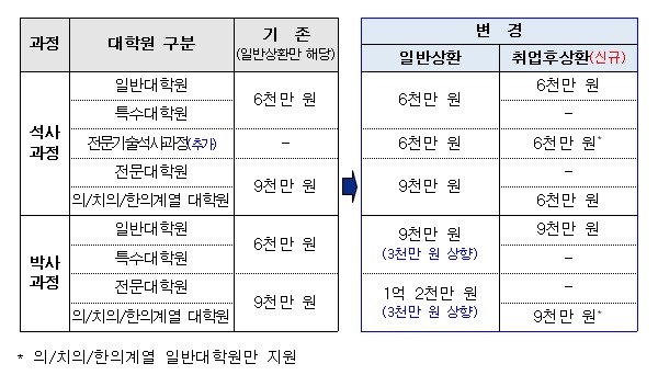 이와 함께 대학원생 대상 취업 후 상환 학자금 대출 시행 및 석·박사 과정의 등록금 소요액 차이 등 현황을 반영해 대학원생의 일반상환 학자금대출의 등록금 대출한도를 확대한다.