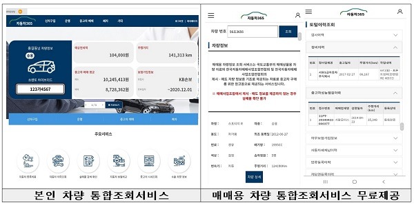 이와 함께, 중고차매매 사기 피해를 예방하기 위해 중고차 정보를 한 페이지에서 확인할 수 있도록 ‘매매용 차량 신속조회 서비스’ 코너를 마련했다.