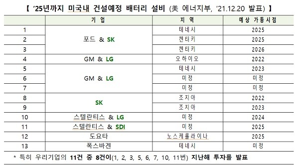 12일 산업통상자원부에 따르면 지난해 말 미국 에너지부(DOE) 발표 내용을 보면 2025년까지 미국 내 건설 예정인 13개 대규모 배터리 생산설비 중 11개가 LG에너지솔루션, SK온, 삼성SDI 등 국내 3사 관련 설비로 확인됐다고 밝혔다.