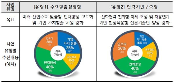 ‘수요맞춤성장형’은 산업계 및 미래사회 수요에 맞는 인력 양성 및 기업 지원 활성화를 목표로 수도권, 충청강원권, 호남제주권, 대경권, 동남권 등 권역별 각 6개교 내외, 총 30개교 내외를 선정한다. 이후 권역 단위 선정 탈락 전문대학 간 전국 단위 경쟁을 통해 14개교 내외를 선정할 예정이다.