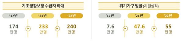 한편 저소득층 지원 방안으로 기초생활보장 수급자는 지난해 233만명에서 240만명으로 확대되고, 위기가구 발굴도 47만 6000명에서 55만명으로 늘어난다.