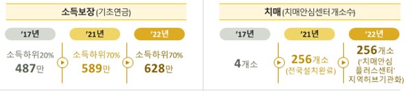 ◆ 노인=어르신의 소득을 보장하는 기초연금은 2017년 소득하위 20%로 487만명이 대상이었는데, 정부는 지속적으로 대상을 넓혀 지난해 소득하위 70%로 넓혔고 올해는 대상인원을 39만명 더 많은 628명으로 확대했다.