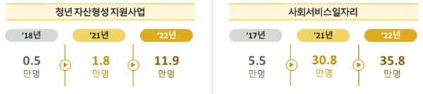 ◆ 청년=올해 청년 자산형성지원사업은 지난해 1만 8000명에서 올해 11만 9000명으로 대폭 확대된다. 또한 사회서비스 일자리도 지난해 30만 8000명에서 5만명 더 늘려 총 35만 8000명을 대상으로 한다.