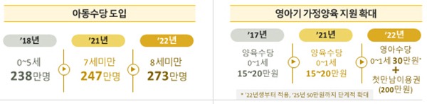 특히 영아기 ‘첫만남이용권’을 도입해 출생하는 모든 아동에게 200만원의 바우처를 지급하고 만 2세 미만의 아동에게는 영아수당을, 기존의 아동수당은 만 7세미만에서 만 8세 미만으로 대상을 확대했다.