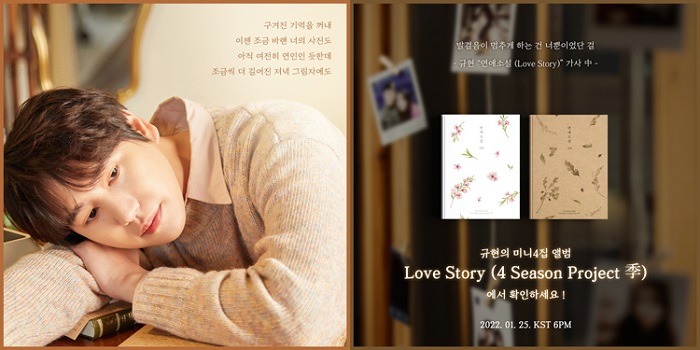 규현은 14일 공식 SNS를 통해 오는 25일 발매하는 네 번째 미니앨범 'Love Story (러브 스토리) (4 Season Project 季)'의 스토리카드 콘텐츠를 공개했다.