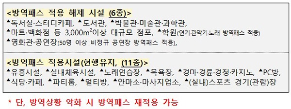 그리고 이번에 해제된 시설을 제외하고 유흥시설, 실내체육시설, 노래연습장, 목욕장업, 식당·카페, PC방, 파티룸 등 위험도가 높은 시설들은 방역패스가 계속 유지된다.