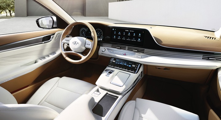 내장은 넓고 길게 뻗은 수평적 디자인을 통해 라운지와 같은 고급스러운 공간으로 꾸며졌다. 현대자동차 최초로 적용된 터치식 공조 컨트롤러는 감성적인 그래픽을 구현하며, 동급 최고 수준의 12.3인치 클러스터와 12.3인치 내비게이션은 경계가 없는 심리스(Seamless) 형태로 자리해 높은 시인성을 제공한다.
