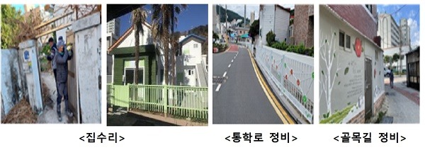 먼저, 화재·안전·위생 등에 문제가 많았던 30년 이상 지난 노후주택 160동에 대해 집수리와 지붕개량 사업을 진행했다. 상습침수지역(300m)에 대해 배수관로와 역류방지시설물을 설치하고, 골목길 정비(750m)와 함께 취학 아동들을 위해 통학로(150m)에 안전시설물과 LED조명을 설치해 마을 환경도 개선했다.