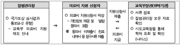 보상 대상에서 제외됨을 통보받은 본인 또는 보호자가 교육부가 지정한 위탁기관에 의료비 영수증 등 증빙서류 포함한 의료비 지원 신청서를 제출하면, 개인별 총액 500만 원 한도 내에서 의료비 등을 지급한다.